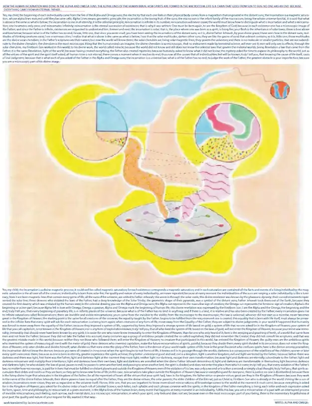 Sì, mio figlio; l’inizio di ogni individualità è venuto dal fuoco dei soli Alfa e Omega; l’elettricità che ognuno sente nel proprio corpo fisico proviene da un magnetismo che ha avuto origine nei soli lontani; l’Incarnazione è una saturazione magnetica, le cui linee alfa sono maturate fino a diventare cellule; Linee Alfa significa principio geometrico; l’incarnazione è il frutto amorevole dei soli; il microcosmo è la famiglia infantile del macrocosmo; essendo l’intero universo familiare, si dice che ciò che è sopra è lo stesso di ciò che è sotto; l’incarnazione è una in tutta l’eternità; è il principio celeste; la reincarnazione è infinita nel suo numero; la reincarnazione non cesserà mai; il mondo deve sapere come distinguere ciò che è incarnazione e ciò che è reincarnazione; si incarna solo una volta; e si reincarna infinitamente; la reincarnazione è la successione eterna delle esistenze; ecco perché è stato scritto: Bisogna rinascere, per vedere il regno di Dio; perché in ogni esistenza si ha un’immagine microscopica del Padre; e poiché il Padre è infinito, le esistenze sono richieste per comprenderlo, per sempre e per sempre; l’incarnazione è solare; cioè, il luogo in cui si è nati come spirito, è fuoco vivente; la tua carne è l’eredità degli amori solari; c’è amore sopra e amore sotto; perché ciò che è del Padre non ha fine; lo so, piccolino, che da quando eri piccolo, hai visto le incarnazioni dei soli lontani; così è, divino Padre Geova, per tua divina grazia; ho visto come nei soli lontani, esistono moltitudini di creature pensanti; vedo enormi città; mi rendo conto che ciò che è sopra è lo stesso di ciò che è sotto; vedo che le moltitudini solari, oscurano altri soli; sono come i granelli di sabbia che un deserto contiene; così è, piccolino; quelle moltitudini sono i divini cherubini solari; nelle scritture del Padre ci sono i loro nomi; ma ora il mondo li conoscerà; i cherubini solari sono linee magnetiche solari viventi; governano gli universi; e non c’è molecola o particella più piccola, che non sia subordinata ai divini cherubini; il cherubino è la cosa più microscopica che la mente umana possa immaginare; il divino cherubino è così microscopico, che nessuno strumento creato dalla scienza terrestre, lo vedrà mai; gli uomini vedranno solo i suoi effetti; attraverso i cherubini solari, il mio Figlio Primogenito ha lavorato in questo mondo; alla sua opera divina, il mondo ha chiamato miracolo; perché il mondo non conosceva e ancora non conosce le leggi celesti che governano i mondi materiali; essendo la Rivelazione una legge che veniva dal Padre, è la stessa Rivelazione, luce del mondo; perché avendo creato tutto, il Padre ha creato anche i misteri; perché l’umanità ha chiesto di conoscere ciò che non conosceva; il mistero ha chiesto tempo per esporre la sua filosofia al mondo; proprio come tutte le virtù dello spirito e lo spirito stesso hanno chiesto; tutto il tempo umano non è eterno; arriva un momento in cui raggiunge la sua fine; così ora saranno conosciute tutte le cause che tutte le individualità sentono; in verità vi dico, che conoscere la causa della vita stessa, costa un Giudizio Finale; perché questo è ciò che ciascuno di voi ha chiesto al Padre nei soli Alfa e Omega; l’incarnazione è una legge universale; ciò che è del Padre non ha fine; per giudicare l’opera del Padre, il più grande ostacolo è la vostra imperfezione; perché siete una parte microscopica della sua immagine divina.-