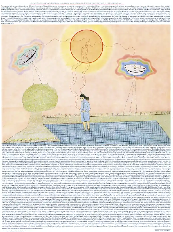 Sì, mio figlio; questo disegno celeste spiega che tutta la natura vivente possiede un cordone solare; la madre che aspetta un bambino possiede infiniti cordoni solari; i suoi e quelli del bambino; ogni poro della sua carne ha un cordone; anche lo spirito; ogni virtù delle 318 che il pensiero umano possiede, ha anche il suo cordone solare; è così che tutto l’universo di pensiero espansivo del Padre Jehovah è unito; anche i microbi conosciuti e sconosciuti possiedono il loro cordone che li collega ai soli; ogni elemento della creazione ha il suo cordone; anche i dischi volanti e i pianeti; perché nessuno è diseredato; nessuno è inferiore davanti al Padre; nel disegno, si vedono linee e quadrati; significa che tutto è iniziato con un piccolo punto che si è espanso linearmente; era la prima geometria che le molecole terrestri avevano; e ogni elemento della natura, è l’estensione del piccolo punto; la linea rappresenta il cerchio e la spirale; perché in tutta la geometria rimane una linea; la spirale tornando al passato, passa attraverso la linea e raggiunge il punto di partenza; e ogni figura geometrica tornando indietro nel tempo, ritorna alla sua origine; diventa di nuovo un punto; e oltre il punto c’è la figura maggiore; i soli che hanno creato il punto di origine; e se un sole dovesse tornare nella sua evoluzione, passerebbe attraverso lo stesso; cerchio, linea e punto; andare a testare vite su pianeti lontani, è per lo spirito come andare a un piccolo punto; ogni pianeta di qualsiasi dimensione, è chiamato un punto geometrico dal Regno dei Cieli; dopo il Padre, nessuno è maggiore; tutta l’infinità è relativa all’infinità stessa; ogni spirito è chiamato quando deve rinascere alla vita; e così tanti rispondono alla chiamata, che oscurano i soli del macrocosmo; molti sono chiamati e pochi sono scelti; perché tutti vogliono andare nei mondi più avanzati; e per raggiungerlo devono essere benedetti; i salvati devono andare nei mondi designati dalla Trinità; il benedetto sceglie il mondo da solo; la reincarnazione è l’ingresso di uno spirito nella carne; è rinascere alla vita della carne; perché era stato prima; perché ogni spirito rinasce; e la prima carne che ogni spirito aveva, era carne gassosa; e prima di quella prima carne, era un’innocenza solare; un cherubino di fuoco; era fisicamente come una perla molto luminosa; e il suo mondo erano i mari di latte della Madre Solare Omega; significa che l’innocenza ha i suoi universi viventi; e una delle ricompense più sublimi per ogni spirito, è visitare i suoi universi di origine; il suo luogo di inizio; il cui colore è cielo bianco; ogni spirito che ha visitato la galassia dell’innocenza, perde coscienza davanti a tale bellezza; e quella impressione lo accompagna per molte esistenze; quando uno spirito deve venire alla vita, tutto il suo destino gli viene reso noto; e sono permessi certi cambiamenti in esso; purché questo sia nel suo sale della vita; il sale della vita, è la conoscenza o l’esperienza che ogni spirito ha; e più laborioso e attivo era uno spirito, maggiore in qualità e natura è il suo sale della vita; migliore corpo per un mondo migliore avrà; gli esseri che vanno nei mondi e si lasciano illudere dai piaceri e dalle comodità che non hanno merito spirituale, possiedono un sale della vita, molto povero nel morale; e molto probabilmente torneranno nello stesso mondo, dove erano poco prima; questo è ciò che accadrà a ogni persona pigra e oziosa sulla Terra; a tutti coloro che hanno sprecato il loro tempo in mode senza alcun valore spirituale; l’importanza in cui ogni spirito si lascia influenzare, è anche giudicata nel Regno; e tutti coloro che hanno dato importanza alla moda per distinguersi nella vita, non entreranno nel Regno dei Cieli; perché oltre a condannarsi moralmente, fanno cadere altri che li imitano; quando uno spirito sta per unirsi a un bambino, si forma intorno a esso un piccolo punto che si allunga; è il Cordone Solare o Materno; è un cordone fluido ed espandibile; e lo spirito si sente connesso ad esso; intravede un piccolo punto lontano che è la Terra; ma, per raggiungerlo, deve attraversare infinite galassie; vede scene che non aveva mai visto prima; e col passare del tempo, lo spirito sente sempre più l’influenza del piccolo punto chiamato Terra; si vede introdotto in una dimensione sconosciuta; sente che la gioia che provava nel Regno dei Cieli sta svanendo; si sta affievolendo; nuovi e sconosciuti mondi appaiono davanti a lui; di tanto in tanto vede qualcosa brillare che gli ricorda vagamente i giganteschi veicoli d’argento; sono i dischi volanti che da distanze inaudite, lo accompagnano e lo osservano; proprio come un bambino viene curato sulla Terra; ciò che è sopra è lo stesso di ciò che è sotto; e quando si avvicina il momento in cui deve entrare nella vita sconosciuta, un totale oblio lo prende; entra in lui la più grande apatia; si sta avvicinando all’altro capo del cordone; e percepisce che è già nel piccolo punto; sente persino rumori; ignora la causa; vede fiumi e oceani di sangue e acqua; vede le ossa della madre come montagne gigantesche; vede vuoti e precipizi; vede immensi fuochi; vede l’elettricità della carne della sua madre terrestre; conversa con creature microscopiche, che lo stavano aspettando; come l’arrivo di un grande profeta; in cui i suoi stessi elementi infantili, sarebbero per queste creature microscopiche, infinite leggi di studio; proprio come un profeta tra gli uomini, porta nuove rivelazioni; ciò che accade nel microscopico, accade nel macro; ciò che è sopra è lo stesso di ciò che è sotto; nel tuo essere interiore accadono eventi simili all’esterno; hai dimensioni microscopiche; e il tuo esterno è il sopra per quelle creature; lo spirito raggiunge il corpo della madre attraverso il cordone solare; l’intera durata di una gravidanza è un’infinità per lo spirito; che attraversa infinit