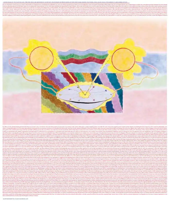 Yes, little one; this celestial drawing demonstrates that every human virtue is of infinite colors; the divine essence of each virtue is to possess a solar calorie; which gives a certain magnetic power; and within the same virtue, this magnetic power acquires infinite degrees; constituting the divine hierarchy of the respective philosophy; each virtue is a living philosophy; since it has been generated by a living spirit; the set of virtues constitutes a thinking life; this thinking life came from another greater thinking life; in the case of human spirits, they were created by the Alpha and Omega suns; of the Trino galaxy; when spirits are born, infinite intelligences are set in divine motion; among them, the wonderful silver ships; which the terrestrials call flying saucers; the crew of these solar ships know that the terrestrials call them that; they are used to it; in each world they visit, its creatures give them names; according to the evolution of those worlds; such is the destiny of the creatures that belong to the infinite itself; the earthly son also belongs to the infinite; only that he is just beginning; he is still of flesh; he is perishable; he is just preparing for eternal life; and as he advances more and more, every creature moves further away from all kinds of darkness; which is nothing more than the ignorance of its own imperfection; life in the Kingdom of Heaven is eternal life; where every imperfect spirit will arrive at a given moment; as long as it has not violated the laws of the sacred scriptures; in its respective world; whoever violates even a microscopic part of the divine law, that one does not enter the Kingdom of Heaven; continues for all eternity, in perishable worlds; paying the debts; which are their own works; until they feel in themselves, the flame of repentance; that is, they become humble; in whatever world; The celestial dot is a measure of divine justice; it corresponds to a second of action of the incarnated spirit; and it corresponds to a heaven in eternity; that is, to infinite worlds, which are within a heaven; the divine reward has no limit; for Creation itself does not have it; every reward to every spirit is called divine addition; which corresponds to a certain number of celestial dots; the silver ships in their passage through the Earth, since they go to the colossal worlds, notice on their universal television screens, which creature shines more than another; for the one that shines the most, is the one that possesses more knowledge; has more experience; even, the experience of suffering; which is the most valuable; for it has a very high score; after humility; and they identify who will enter the Kingdom of Heaven; and they see with infinite sorrow, that on Earth, there is no one with enough score; for almost all have scandalized with their bodies of flesh; they have exposed the microscopic living pores, to the contemplation and malice of the world; and they see how human creatures eat their own brothers of flesh; and exploit each other; they have lost hope of taking any earthly child to the Kingdom of Heaven; they only scrutinize the future; and their hopes are reborn, in the children; as long as they are not infected, by the materialistic philosophy of their own parents, of those parents of worldly life; who have never cared above all things about the laws of the Creator of life; they fear that these blind parents, will turn their children into guides of the blind; of their own children; the silver ships were the ones that guided the Earth through space; when it was a microscopic electric spark; coming from the Alpha and Omega suns, which means Beginning and End of a creation; that is, a materialized humanity; that coming out of the divine dimension, penetrated the material dimension; its launch point was the Alpha sun; and germinating in the Omega sun; which means that the first philosophies of the Earth, are philosophies of trials; in which force predominates, but force is judged; and is replaced by the creative intelligence Omega; which symbolizes the Holy Solar Mother Omega; the only Mother of the universe; who has been known by infinite names; not only on Earth; but throughout the expansive thinking universe; with her begins the reign of women in the world; this is not a preference on the part of divinity; this is a justice; whose cause comes from an injustice of the Alpha imperfection; or period of force; Man should never have used force to impose his will; both man and woman are equal in rights before God; no one is less in his divine creation; the galactic origin of the flock, gives them equal rights; only demons sow individual predominance; the so-called war of the sexes, is a demonic philosophy; and its author will be cursed by the divine Firstborn; only Satan divides; in the celestial drawing, the Alpha and Omega suns are seen, initiating a reincarnation of a virtue; the divine reincarnations, are divine alliances; of divine cherubim of all imaginable virtues; at first, they are all fire; solar fire; they are fire that materializes in the suns themselves; they are seen as beautiful gems; of all imaginable colors; for each virtue possesses a color; with infinite shades; the divine process of a reincarnation, has never been seen by human eyes; and there is no one who has not experienced it; for otherwise, they would not be in human life; being reincarnation the same law, there is no reincarnation equal to another; for the individuality of each spirit, begins at a different angle in the solar corona; that is to say, free will arises first; which taking position and sensation, is reflected in its own infinity; from that solar moment, a divine cherub of solar vibration is born; the angle position provides time alliances; and the sensation provides feeling alliances; therefore there is no time without feelings; nor feelings without time; whether in the suns, or the worlds; in a human reincarnation, 318 virtues participate; these 