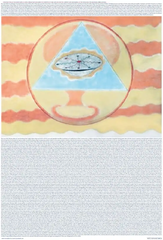 Sì, mio figlio; so cosa stai pensando; è vero; queste navi sono costruite in tutti i soli e mondi paradisiaci; per raggiungere tale perfezione nella loro costruzione, è necessaria un’evoluzione superiore a quella umana; richiede di essere nato infinite volte; richiede di aver conosciuto infinite scienze; proprio come il viaggio che il figlio umano ha dovuto fare per costruire le navi volanti che possiede; ciò che è sopra è lo stesso di ciò che è sotto; solo che le scienze sono relative come i mondi stessi; la costruzione dei cosiddetti dischi volanti è qualcosa che affascinerà il mondo; perché ogni spirito li ha visti prima di lasciare il Regno dei Cieli; queste navi sublimi che entrano ed escono dai colossali soli hanno portato vita agli spiriti della Terra; e non solo della Terra; ma di mondi infiniti che erano nello spazio prima che la tua Terra nascesse; quei mondi non sono più nello spazio; altri li hanno succeduti; e le creature di quei mondi che non ci sono più sono attualmente i membri dell’equipaggio di queste navi eterne; perché l’universo materiale finirà; e queste navi sopravviveranno; perché tutto ciò che viene dallo spirito è eterno; e in questa eternità, lo spirito era anche materia; perché entrambi possiedono libero arbitrio; entrambi si succedono nell’eternità; le navi d’argento sono navi fatte di fluidi solari; che sono come le virtù dello spirito; i Fluidi Solari sono una fonte di magnetismo; questo magnetismo è fuoco; un fuoco creativo; che crea materia alla velocità del pensiero solare; una velocità che la scienza terrestre non può calcolare; perché il calcolo terrestre è microscopico; il Fluido Solare è il sale dell’individualità dei soli; sale magnetico; ed è relativo come la sua eternità; qui l’individualità diventa materia; e mantiene il suo libero arbitrio; i Fluidi Solari sono anche forza; una forza che riempirebbe di terrore la creatura umana; perché la forza di un sole è capace di mantenere pianeti colossali nel suo raggio d’azione; e questo eternamente; è la gravitazione universale; tutto nello spazio è sospeso; sia sopra che sotto; le navi d’argento seguono una legge simile; poiché la Trinità Solare è ovunque, perché ci sono soli in tutto l’infinito; queste navi seguono la loro linea solare successiva nei loro viaggi attraverso il cosmo; nelle loro rispettive Trinità Solari; un sole sostituisce un altro; e così possono viaggiare eternità; questo mostra che ci sono infinite categorie di navi; secondo la loro relatività solare; secondo la loro gerarchia solare; nel Regno dei Cieli, la conoscenza costituisce potere; la conoscenza dà qualità alla materia fatta potere; queste navi che confondono i figli terrestri sono navi che hanno rispettato le stesse leggi fisiche che voi state appena iniziando a rispettare; perché queste creature divine rispettano anche la legge divina; ciò che è sopra è lo stesso di ciò che è sotto; erano piccoli e umili; erano anche piccoli scimmie di carne; come lo siete ora; e ora sono grandi nel Regno dei Cieli; alcuni sono primi e altri dopo; una successione eterna di creature che non cesserà mai; questa successione eterna di esseri era già lì quando il tuo pianeta Terra è nato; il potere illimitato di queste navi lo sta dimostrando a voi; eternità avanti e quando il vostro mondo non sarà più nello spazio, anche voi sarete grandi nel Regno dei Cieli; la legge divina è universale; è per tutti i mondi; per quelli che erano, quelli che sono e quelli che saranno; tutti avete lo stesso inizio; un inizio che è venuto dal Padre; è venuto dal fuoco; è venuto dalle luminari solari; il tuo corpo fisico non ha elettricità e calore? E il tuo pianeta non ha fuoco al suo centro? perché la materia e lo spirito sono venuti e vengono ancora dal fuoco solare; sono venuti dallo stesso punto; e sono creati a immagine e somiglianza di Dio Padre; sono anche di fuoco; le navi d’argento mantengono nell’eternità il sigillo divino del Padre; rimangono di fuoco; magnetico e solare; la trasformazione dal fuoco alla materia è qualcosa che affascinerà il mondo; questa legge solare che siete lontani dal sospettare sarà resa nota al mondo per la prima volta; e ricevendo tale luce sublime dall’Agnello di Dio, i malintesi finiranno; finirà tutto un business a spese della fede e delle credenze; molti demoni mondani negano davanti al mondo l’esistenza dei miei messaggeri; a tali dico: griderete ad alta voce e in pubblico ciò che avete negato arrogantemente durante la vita; chi nega un profeta o un messaggero dai cieli, come queste navi, nega il Padre; e chi nega il Padre, nega la propria eternità; nega il suo ingresso nel Regno dei Cieli; questi sapientoni dimenticano che tutti gli spiriti umani sono messi alla prova nelle loro stesse teorie e affermazioni; secondo per secondo; dal momento in cui hanno conoscenza del bene e del male; fino all’ultimo respiro di vita; ciò che non esiste nel tuo mondo esiste in altri; non ti è stato insegnato che il Padre ha molte dimore? e che rinasci? dando origine a nuove scienze viventi; solo attraverso la conoscenza appresa nei mondi si raggiunge il Padre; proprio come hanno fatto le creature celesti che governano queste navi; le navi che milioni di voi negano sono state quelle che hanno fatto nascere il vostro pianeta; hanno accompagnato la scintilla solare attraverso lo spazio; l’hanno assistita con amore infinito; proprio come una madre si prende cura del suo bambino; perché tutti sono infanti; tutti sono figli davanti al divino Padre; sia la materia che lo spirito; nessuno è meno davanti al Creatore dell’universo; tutti hanno gli stessi diritti; sia sopra che sotto; nel macrocosmo e nel microcosmo; la nascita del tuo pianeta e di tutti i pianeti dell’universo è dovuta a queste navi; il loro numero è infinito come l’universo stesso, e non c’è creazione nell’infinito in cui queste navi non abbiano partecipato; c