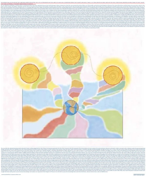 Yes, my child; the world that is coming will be a world led by those who were exploited; because the Earth belongs to them; it always has; from the very moment the divine Father said: The humble are the first in the Kingdom of Heaven; First, means first above and first below; because what is above is the same as what is below; the Father’s mandates are the same at any point in the universe; the humble are always above all others; in this world, the men who have directed its destinies did the opposite; the humble were never allowed to lead the world; men usurped the divine mandate; truly I tell you, all those who participated in this outrage will pay for it; no capitalist will remain; they will be uprooted from this world; because the capitalist philosophy is not from the Kingdom of Heaven; no one knows them; nor will anyone defend them; here it is better for them not to have asked to come to this world; because they would not be on trial; here is the weeping and gnashing of teeth, of a tree that the Father Jehovah did not plant; here is the fate that awaits those who dared to govern a world, leaving the Father aside; they will pay for it; because they asked for it in the Kingdom of Heaven; everything is asked for in the Kingdom; in that everything, even the way of being punished is asked for, if the Father’s law is violated; all those who participated in capitalism violated the law; upon them falls all the blood that cried for justice through the centuries; upon them falls all the moral pain caused by need, hunger, insecurity; truly I tell you, the nature of the Father provides for all; no one should have gone hungry in this world; no one should have been either rich or poor; because you all asked for equality before the Father; Woe to you, hypocritical rich! Woe to your spirits! because you will envy the dead; here everything will be taken from you; individuals and rich nations, impoverished; because the enjoyment of such abundance never belonged to you; if the Father allowed it, it was out of respect for the time of life of trial that you asked for; and that had to be fulfilled; that time has been fulfilled; it is demonstrated by the arrival of the Revelation itself; here begins for you, followers of gold, your public trial; because you asked for judgment, just as it is aired in the Kingdom of Heaven; there nothing is hidden; occultism in any of its forms is not known in the Kingdom; no one hides anything from anyone; here everyone who even pronounced the word occultism will not enter the Kingdom of Heaven; because it is a word that should never have been known; just as this world should never have known the word capitalism; truly I tell you, every custom or tradition, coming from a strange way of life like yours, prevents its protagonists from entering the Kingdom of Heaven; being illegal the mandate, coming from men, so is the most microscopic thing that came from it; every thought was influenced; by something that should never have been; that something has no inheritance in the Kingdom; because it did not come from the Kingdom; and everything that did not come from the Kingdom, no one knows it in the Kingdom; here you who lived a strange way of life, where gold was more important, and not the Father, are also unknown in the Kingdom; truly I tell you, in the Kingdom of Heaven, only what belongs to the Father is known and respected; the creatures who having asked to know lives on distant planets, and did not comply with the respective law of the Father, do not return to the Kingdom of the Father; until they pay the last debt; be it molecule, idea, gesture, intention, instant; everything that was imagined is paid for; because everything imagined becomes life in the presence of the Father; and they ask for justice in their respective laws; because no one is disinherited in the creation of the Father; this is how everything you were in earthly life is reborn in the presence of the Father; molecules, cells, hair, eyebrows, virtues, ideas; nothing, no matter how microscopic, is left without its justice; here is the supreme explanation that corresponds to the equality taught by the Father; being everything living in the universe, matter and spirit have the same rights; here all spiritual importance feels shaken; because it ceases to be; no one is more important than another before the Father; all are equal in rights; and if the Father has a preference for anyone, be sure that it is the most humble among the humble; here in this world, everything is done to prevent there from being humble; with the selfish and interested way of life that you were given, no one cultivates humility; that is why no one from this world will enter the Kingdom of the Father; without humility, it is impossible to enter the Kingdom of Heaven; truly I tell you, it is enough for a flash of ambition to have passed through your mind, and you will not enter the Kingdom of the Father; here your way of life based on gold changes your innocence; and the slightest microscopic variation in innocence, and the spirit does not enter the Kingdom of Heaven; here is the work of gold on all innocence; here is the deceiver of the world; here is the demon of this world; here is Satan who divides innocence between good and evil; here is your yoke in all ages of the Earth; in every moment it stole a divine right from you; and every moment stolen from another is returned; here for the same time that the right of the humble to govern the world was usurped, they will govern it; here is the birth of a New World; a world that should have always existed; because the divine mandate was given before all generations; here the same deceived will crush their deceivers; here is the fall of the beast; here are the worshipers of the accursed Osiris; here are the followers of gold; here are those who divide the children of the Father; here are the corrupted of the universe; here are those who serve many masters; here are those who served gold and 