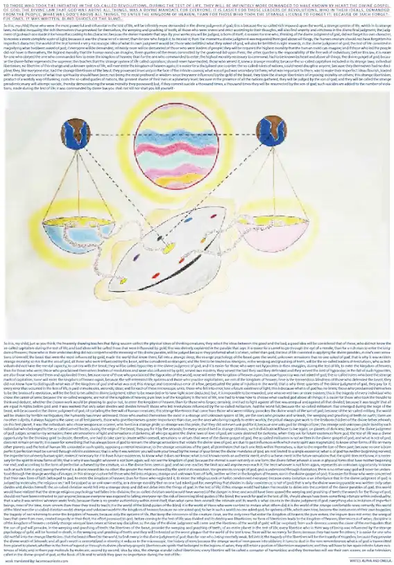 Così è, figlio mio; coloro che erano i più potenti e influenti nella prova della vita, saranno infinitamente più richiesti nel giudizio divino di dio; questo perché i cosiddetti ricchi hanno imposto al mondo un sistema di vita strano, che nelle sue strane leggi includeva l’ineguaglianza; i ricchi stessi hanno così provocato per sé stessi il pianto e lo stridore dei denti; tutti coloro che erano severi e rigorosi secondo i loro pensieri, troveranno anche severità e rigore nel giudizio finale divino; il giudizio di dio ciascuno lo ha fatto per sé stesso secondo il proprio carattere; perché il mandato divino che dice: Dai tuoi lavori sarai giudicato, nasce da sé stesso; è più facile per uno che, pensando al giudizio divino di dio, non ha dimenticato il proprio carattere, ricevere un punteggio di luce più completo; perché era il carattere di un peccatore; che per uno che lo ha dimenticato, riceverlo; dal momento in cui è stato richiesto un giudizio divino da dio sopra ogni cosa, la creatura umana non avrebbe dovuto dimenticare il proprio carattere imperfetto; il mondo della prova ha formato un’idea molto microscopica di quale sarebbe stato il proprio giudizio; coloro che hanno sminuito ciò che hanno chiesto a dio, saranno anche sminuiti nelle ricompense di luce, nel giudizio divino di dio; la prova della vita consisteva nell’ingrandire ciò che era stato chiesto a dio; se tutti saranno richiesti, infinitamente più sarà richiesto a coloro che erano leader del popolo; sarà richiesta la massima moralità che la mente umana possa immaginare; e se coloro che guidavano il popolo non avevano in sé stessi la massima moralità che la mente umana possa immaginare, tre quarti degli errori commessi dai governati ricadono su di loro; l’altro quarto è responsabilità del libero arbitrio degli individui; davanti a questa legge, è più facile per uno che ha obbedito a colui che lo comandava entrare nel regno dei cieli; che per colui che comandava entrare; la massima moralità necessaria per comandare doveva essere conosciuta a memoria e sopra ogni cosa, il divino vangelo di dio; perché il padre divino rappresenta il supremo; questo insegna che lo strano sistema di vita chiamato capitalismo non avrebbe mai dovuto esistere; coloro che lo servivano conoscevano una strana moralità; perché il cosiddetto capitalismo includeva nelle sue strane leggi il libertinismo individuale; nessun libertino di questo strano e sconosciuto sistema di vita entrerà mai più nel regno dei cieli; è più facile per uno disciplinato entrare; i cosiddetti governanti delle nazioni non potevano mai disciplinare nessuno, perché essi stessi non avevano disciplina; essi stessi, come tutti gli altri, avevano lo strano libertinismo della bestia; possedevano insicurezza di fronte all’infinito cosmo; ciò che era di dio era secondario per loro; ciò che era importante per loro era far fiorire le loro idee imperfette, cariche di una strana ignoranza di ciò che la vera spiritualità avrebbe dovuto essere; non essendo i più profondi nella saggezza poiché erano influenzati dall’oro della bestia, hanno preso lo strano libertinismo di imporre la moralità agli altri; questo strano libertinismo, prodotto di un modo mondano di pensare, costa ai cosiddetti guide delle nazioni la più grande vergogna delle loro vite a livello planetario; perché alla presenza di tutte le nazioni riunite saranno giudicati dal figlio di dio; e saranno chiamati i strani presidenti; molti tenteranno il suicidio dimostrando così la debole moralità che possedevano; ma se si suicidano mille volte, mille volte saranno resuscitati dal figlio di dio; tali suicidi si aggiungono al numero delle violazioni commesse durante la prova della vita; fu comandato dalla legge divina non uccidere né uccidersi.-