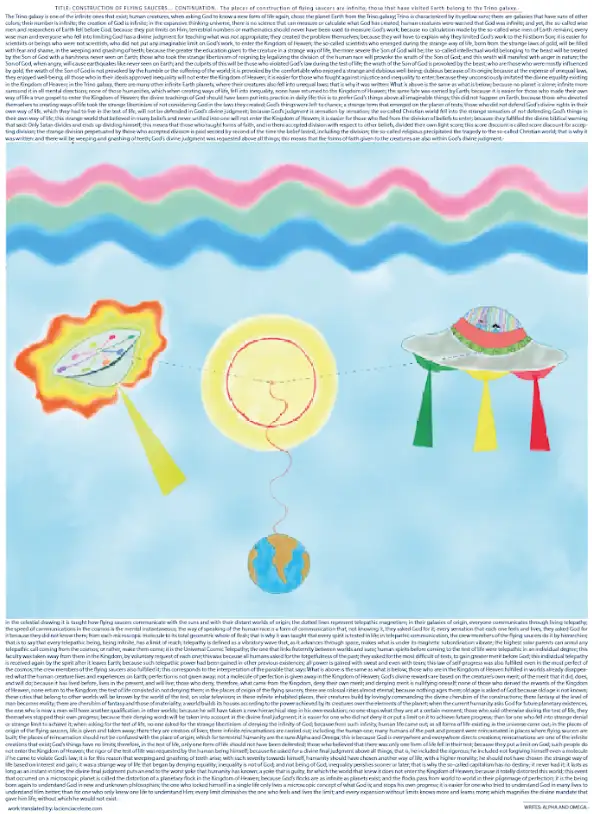 in the celestial drawing it is taught how flying saucers communicate with the suns and with their distant worlds of origin; the dotted lines represent telepathic magnetism; in their galaxies of origin, everyone communicates through living telepathy; the speed of communications in the cosmos is the mental instantaneous; the way of speaking of the human race is a form of communication that, not knowing it, they asked God for it; every sensation that each one feels and lives, they asked God for it because they did not know them; from each microscopic molecule to its total geometric whole of flesh; that is why it was taught that every spirit is tested in life; in telepathic communication, the crew members of the flying saucers do it by hierarchies; that is to say that every telepathic being, being infinite, has a limit of reach; telepathy is defined as a vibratory wave that, as it advances through space, makes what is under its magnetic subordination vibrate; the highest solar parents can annul any telepathic call coming from the cosmos; or rather, make them come; it is the Universal Cosmic Telepathy; the one that links fraternity between worlds and suns; human spirits before coming to the test of life were telepathic in an individual degree; this faculty was taken away from them in the Kingdom, by voluntary request of each one; this was because all humans asked for the forgetfulness of the past; they asked for the most difficult of tests, to gain greater merit before God; this individual telepathy is received again by the spirit after it leaves Earth; because such telepathic power had been gained in other previous existences; all power is gained with sweat and even with tears; this law of self-progress was also fulfilled even in the most perfect of the cosmos; the crew members of the flying saucers also fulfilled it; this corresponds to the interpretation of the parable that says: What is above is the same as what is below; those who are in the Kingdom of Heaven fulfilled in worlds already disappeared what the human creature lives and experiences on Earth; perfection is not given away; not a molecule of perfection is given away in the Kingdom of Heaven; God’s divine rewards are based on the creature’s own merit; of the merit that it did, does, and will do; because it has lived before, lives in the present, and will live; those who deny, therefore, what came from the Kingdom, deny their own merit; and denying merit is nullifying oneself; none of those who denied the rewards of the Kingdom of Heaven, none return to the Kingdom; the test of life consisted in not denying them; in the places of origin of the flying saucers, there are colossal cities almost eternal; because nothing ages there; old age is asked of God because old age is not known; these cities that belong to other worlds will be known by the world of the test, on solar television; in these infinite inhabited places, their creatures build by lovingly commanding the divine cherubim of the constructions; there fantasy at the level of man becomes reality; there are cherubim of fantasy and those of materiality; a world builds its houses according to the power achieved by its creatures over the elements of the planet; when the current humanity asks God for future planetary existences, the one who is now a man will have another qualification in other worlds; because he will have taken a new hierarchical step in his own evolution; no one stops what they are at a certain moment; those who said otherwise during the test of life, they themselves stopped their own progress; because their denying words will be taken into account in the divine final judgment; it is easier for one who did not deny it or put a limit on it to achieve future progress; than for one who fell into strange denial or strange limit to achieve it; when asking for the test of life, no one asked for the strange libertinism of denying the infinity of God; because from such infinity, human life came out; as all forms of life existing in the universe came out; in the places of origin of the flying saucers, life is given and taken away; there they are creators of lives; there infinite reincarnations are carried out; including the human one; many humans of the past and present were reincarnated in places where flying saucers are built; the places of reincarnation should not be confused with the place of origin; which for terrestrial humanity are the suns Alpha and Omega; this is because God is everywhere and everywhere directs creations; reincarnations are one of the infinite creations that exist; God’s things have no limits; therefore, in the test of life, only one form of life should not have been defended; those who believed that there was only one form of life fell in their test; because they put a limit on God; such people do not enter the Kingdom of Heaven; the rigor of the test of life was requested by the human being himself; because he asked for a divine final judgment above all things; that is, he included the rigorous; he included not forgiving himself even a molecule if he came to violate God’s law; it is for this reason that weeping and gnashing of teeth arise; with such severity towards himself, humanity should have chosen another way of life, with a higher morality; he should not have chosen the strange way of life based on interest and gain; it was a strange way of life that began by denying equality; inequality is not of God; and not being of God, inequality perishes sooner or later; that is why the so-called capitalism has no destiny; it never had it; it lasts as long as an instant in time; the divine final judgment puts an end to the worst yoke that humanity has known; a yoke that is guilty, for which the world that knew it does not enter the Kingdom of Heaven; because it totally distorted this world; this event that occurred on a microscopic planet is called the distortion of a planetary flock in the Kingdom of Heaven; because God’s flocks are as in