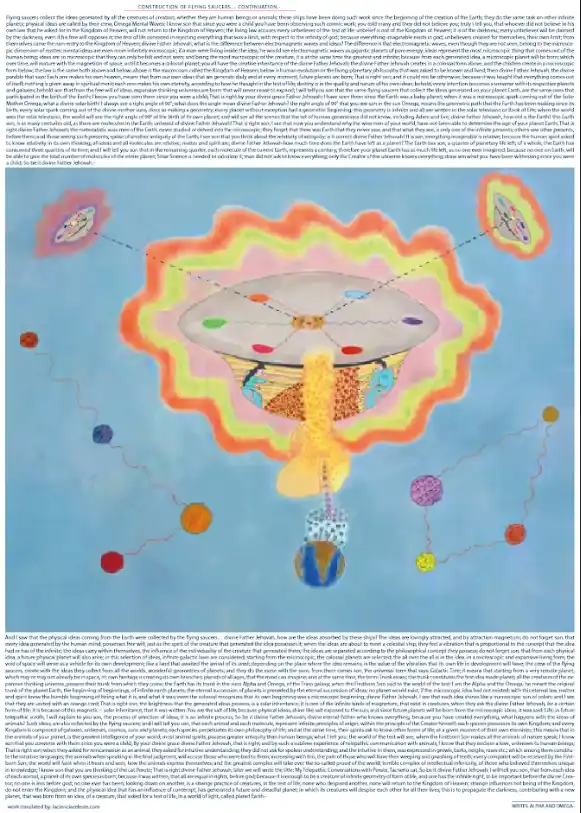 I dischi volanti raccolgono le idee generate da tutte le creature della creazione; che siano esseri umani o animali; queste navi svolgono tale lavoro sin dall’inizio della creazione della Terra; svolgono lo stesso compito su altri pianeti infiniti; le idee fisiche sono chiamate dal loro equipaggio, Onde Mentali Omega; so figlio che fin da bambino hai osservato tale lavoro cosmico; lo hai detto a molti e non ti hanno creduto; in verità ti dico, che chi non ha creduto nella propria legge che ha chiesto nel Regno dei Cieli, non tornerà nel Regno dei Cieli; la legge vivente accusa ogni incredulo della prova della vita; l’incredulità non è del Regno dei Cieli; è delle tenebre; ogni incredulo sarà reclamato dalle tenebre, anche se il suo libero arbitrio si oppone; la prova della vita consisteva nel rifiutare tutto ciò che era un limite, rispetto all’infinità di Dio; perché tutto ciò che è immaginabile esiste in Dio; gli increduli hanno creato per se stessi, il proprio limite; da loro stessi è venuta la non-entrata nel Regno dei Cieli; divino Padre Geova, qual è la differenza tra onde elettromagnetiche e idee? La differenza è che le onde elettromagnetiche, anche se non sono viste, appartengono alla dimensione microscopica della materia; le idee mentali sono ancora più infinitamente microscopiche; se un uomo vivesse all’interno dell’idea, vedrebbe le onde elettromagnetiche come pianeti giganteschi di pura energia; le idee rappresentano la cosa più microscopica che esce dall’essere umano; le idee sono così microscopiche che possono solo essere sentite e non viste; ed essendo la cosa più microscopica della creatura, è allo stesso tempo la più grande e infinita; perché da ogni idea generata, nascerà un pianeta microscopico; che col tempo, maturerà con il magnetismo dello spazio, fino a diventare un pianeta colossale; tutti voi avete l’eredità creativa del divino Padre Geova; il divino Padre Geova crea in forma colossale sopra, e i figli creano in forma microscopica sotto; la legge è la stessa sia sopra che sotto; sopra è il macrocosmo chiamato il Regno dei Cieli; sotto è l’evoluzione umana o la filosofia vivente-planetaria che è stata chiesta di essere conosciuta e vissuta; allora divino Padre Geova, la parabola divina che dice: Ognuno fa il proprio cielo, significa che dalle nostre stesse idee che generiamo quotidianamente e in ogni momento, nascono futuri pianeti; Esatto figlio; e non potrebbe essere altrimenti; perché è stato insegnato che tutto esce da sé; nulla è regalato nel merito spirituale; ognuno fa la propria eternità, secondo come ha pensato nella prova della vita; il destino è nella qualità e natura delle proprie idee; ecco, ogni intenzione diventa un universo con i suoi rispettivi pianeti e galassie; ecco figlio che dal libero arbitrio delle idee, nascono universi di pensiero espansivo; che non cesseranno mai di espandersi; ti dirò figlio che gli stessi dischi volanti che raccolgono le idee generate sul tuo pianeta Terra, sono gli stessi che hanno partecipato alla nascita della Terra; so che li hai visti fin da bambino; Esatto per tua divina grazia Padre Geova; li ho visti da quando la Terra era un pianeta-bambino; quando era una scintilla microscopica uscita dalla Madre Solare Omega; che nascita solare divina! Vedo sempre un angolo retto di 90°; cosa significa l’angolo divino Padre Geova? l’angolo retto di 90° che vedi figlio nel sole Omega, significa il percorso geometrico che la Terra ha fatto dalla sua nascita; ogni scintilla solare uscita dai soli madri divini, lo fa creando una geometria; ogni pianeta senza eccezione ha avuto un inizio geometrico; questa geometria è infinita e tutte sono scritte nella televisione solare o Libro della Vita; quando il mondo vedrà la televisione solare, il mondo vedrà l’angolo retto di 90° della nascita del proprio pianeta; e vedrà tutte le scene che l’insieme delle generazioni umane non conosceva, compresi Adamo ed Eva; divino Padre Geova, quanti anni ha la Terra? questa Terra figlio, ha tanti secoli, quanti sono le molecole nella Terra; inaudito divino Padre Geova! Esatto figlio; vedo che ora capisci perché i saggi del tuo mondo, non sono stati in grado di determinare l’età del tuo pianeta Terra; Esatto divino Padre Geova; i saggi materialisti della Terra, non hanno mai studiato o approfondito il microscopico; dimenticano che c’era una Terra che non hanno mai visto; e che ciò che vedono, è solo uno degli infiniti presenti; altri hanno visto altri presenti, prima di loro; e quelli vedendo tali presenti, parlavano di un’altra antichità della Terra; vedo figlio che pensi alla relatività dell’antichità; è corretto divino Padre Geova? Lo è figlio; tutto ciò che è immaginabile è relativo; perché lo spirito umano ha chiesto di conoscere la relatività nel proprio pensiero; tutte le idee e tutte le molecole sono relative; la materia e lo spirito lo sono; divino Padre Geova quanto tempo resta alla Terra come pianeta? La Terra ha figlio, un quarto di vita planetaria rimasta; di un intero, la Terra ha consumato tre quarti del suo tempo; e ti dirò figlio che nel quarto rimanente, ogni molecola dell’attuale Terra, rappresenta un secolo; quindi il tuo pianeta Terra ha tanta vita rimasta, quanto nessuno ha mai immaginato; perché nessuno sulla Terra, sarà in grado di dare il numero totale di molecole dell’intero pianeta; è necessaria la Scienza Solare per calcolarlo; l’uomo non ha chiesto di sapere tutto; solo il Creatore dell’universo sa tutto; disegna figlio ciò che hai visto fin da bambino; Così sia divino Padre Geova.-