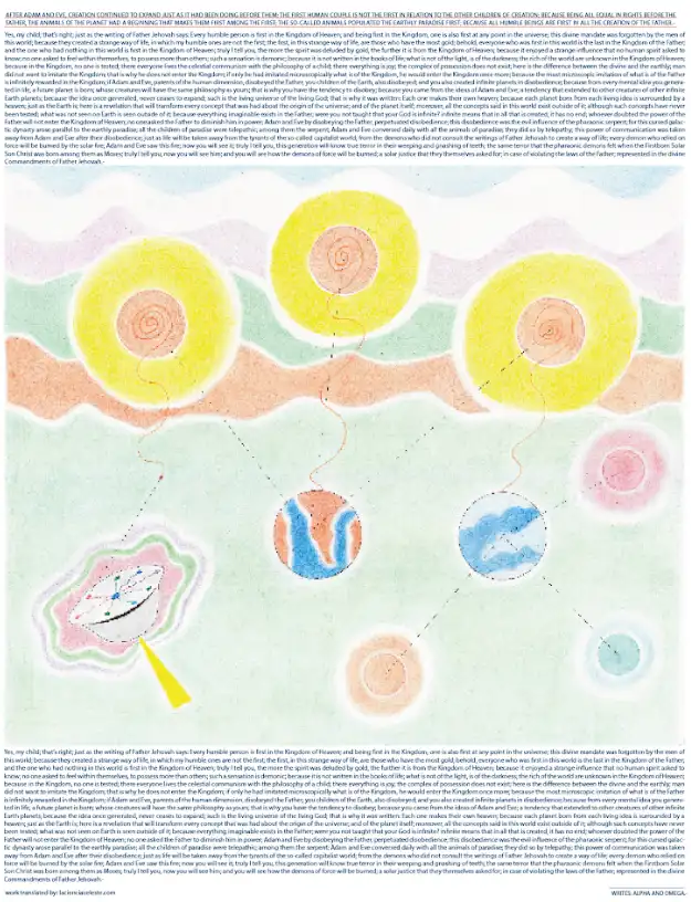 Sì, mio figlio; è così; proprio come dice la scrittura del Padre Geova: Ogni persona umile è prima nel Regno dei Cieli; e essendo prima nel Regno, si è anche prima in qualsiasi punto dell’universo; questo mandato divino è stato dimenticato dagli uomini di questo mondo; perché hanno creato un modo di vivere strano, in cui i miei umili non sono i primi; i primi, in questo strano modo di vivere, sono quelli che hanno più oro; ecco, chiunque fosse primo in questo mondo è l’ultimo nel Regno del Padre; e chi non aveva nulla in questo mondo è primo nel Regno dei Cieli; in verità vi dico, più lo spirito è stato ingannato dall’oro, più è lontano dal Regno dei Cieli; perché ha goduto di un’influenza strana che nessuno spirito umano ha chiesto di conoscere; nessuno ha chiesto di sentire dentro di sé, di possedere più degli altri; tale sensazione è demoniaca; perché non è scritta nei libri della vita; ciò che non è della luce, è delle tenebre; i ricchi del mondo sono sconosciuti nel Regno dei Cieli; perché nel Regno, nessuno è messo alla prova; lì tutti vivono il comunismo celeste con la filosofia di un bambino; lì tutto è gioia; il complesso del possesso non esiste; ecco la differenza tra il divino e il terrestre; l’uomo non ha voluto imitare il Regno; ecco perché non entra nel Regno; se solo avesse imitato microscopicamente ciò che è del Regno, entrerebbe nel Regno ancora una volta; perché la più microscopica imitazione di ciò che è del Padre è infinitamente ricompensata nel Regno; se Adamo ed Eva, genitori della dimensione umana, hanno disobbedito al Padre, voi figli della Terra, avete anche disobbedito; e avete anche creato infiniti pianeti nella disobbedienza; perché da ogni idea mentale che avete generato nella vita, nasce un futuro pianeta; le cui creature avranno la stessa filosofia vostra; ecco perché avete la tendenza a disobbedire; perché siete venuti dalle idee di Adamo ed Eva; una tendenza che si è estesa ad altre creature di altri pianeti terrestri infiniti; perché l’idea una volta generata, non smette mai di espandersi; tale è l’universo vivente del Dio vivente; ecco perché è stato scritto: Ognuno fa il proprio cielo; perché ogni pianeta nato da ogni idea vivente è circondato da un cielo; proprio come la Terra; ecco una rivelazione che trasformerà ogni concetto che si aveva sull’origine dell’universo; e del pianeta stesso; inoltre, tutti i concetti detti in questo mondo esistono al di fuori di esso; anche se tali concetti non sono mai stati testati; ciò che non è stato visto sulla Terra è visto al di fuori di essa; perché tutto ciò che è immaginabile esiste nel Padre; non vi è stato insegnato che il vostro Dio è infinito? infinito significa che in tutto ciò che è creato, non ha fine; chi ha dubitato del potere del Padre non entrerà nel Regno dei Cieli; nessuno ha chiesto al Padre di diminuirlo nel potere; Adamo ed Eva disobbedendo al Padre, hanno perpetuato la disobbedienza; questa disobbedienza era l’influenza malvagia del serpente faraonico; perché questa maledetta dinastia galattica è sorta parallelamente al paradiso terrestre; tutti i figli del paradiso erano telepatici; tra loro il serpente; Adamo ed Eva conversavano quotidianamente con tutti gli animali del paradiso; lo facevano per telepatia; questo potere di comunicazione è stato tolto ad Adamo ed Eva dopo la loro disobbedienza; proprio come la vita sarà tolta ai tiranni del cosiddetto mondo capitalista; dai demoni che non hanno consultato gli scritti del Padre Geova per creare un modo di vivere; ogni demone che si è affidato alla forza sarà bruciato dal fuoco solare; Adamo ed Eva hanno visto questo fuoco; ora lo vedrete; in verità vi dico, questa generazione conoscerà il vero terrore nel loro pianto e stridore di denti; lo stesso terrore che i demoni faraonici hanno provato quando il Figlio Primogenito Solare Cristo è nato tra loro come Mosè; in verità vi dico, ora lo vedrete; e vedrete come i demoni della forza saranno bruciati; una giustizia solare che loro stessi hanno chiesto; in caso di violazione delle leggi del Padre; rappresentate nei Comandamenti divini del Padre Geova.-